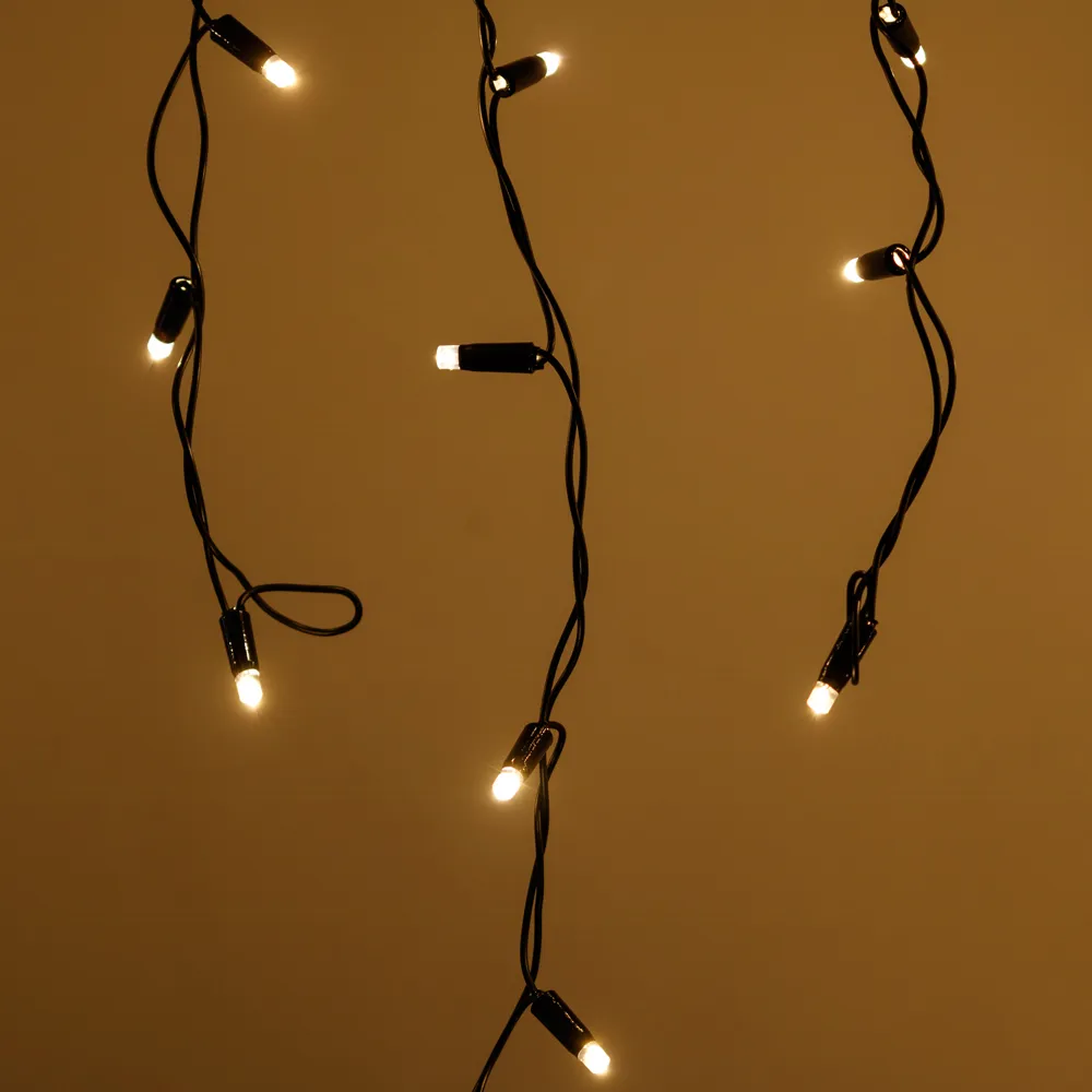 Светодиодная бахрома Pro. Размер 4000x600 мм (длина 4000 мм, по длине 32 нити высотой 200/600 мм). Количество светодиодов 128 шт размером 7 мм. Цвет свечения ТЕПЛЫЙ БЕЛЫЙ (3000 К), эффект постоянного свечения с резким световым рисунком (прозрачная вогнутая линза). Провод черный, резиновый. Питание 230 В, Мощность 8 Вт, защита IP65, применение на улице под навесом. Аксессуары для подключения приобретаются отдельно.