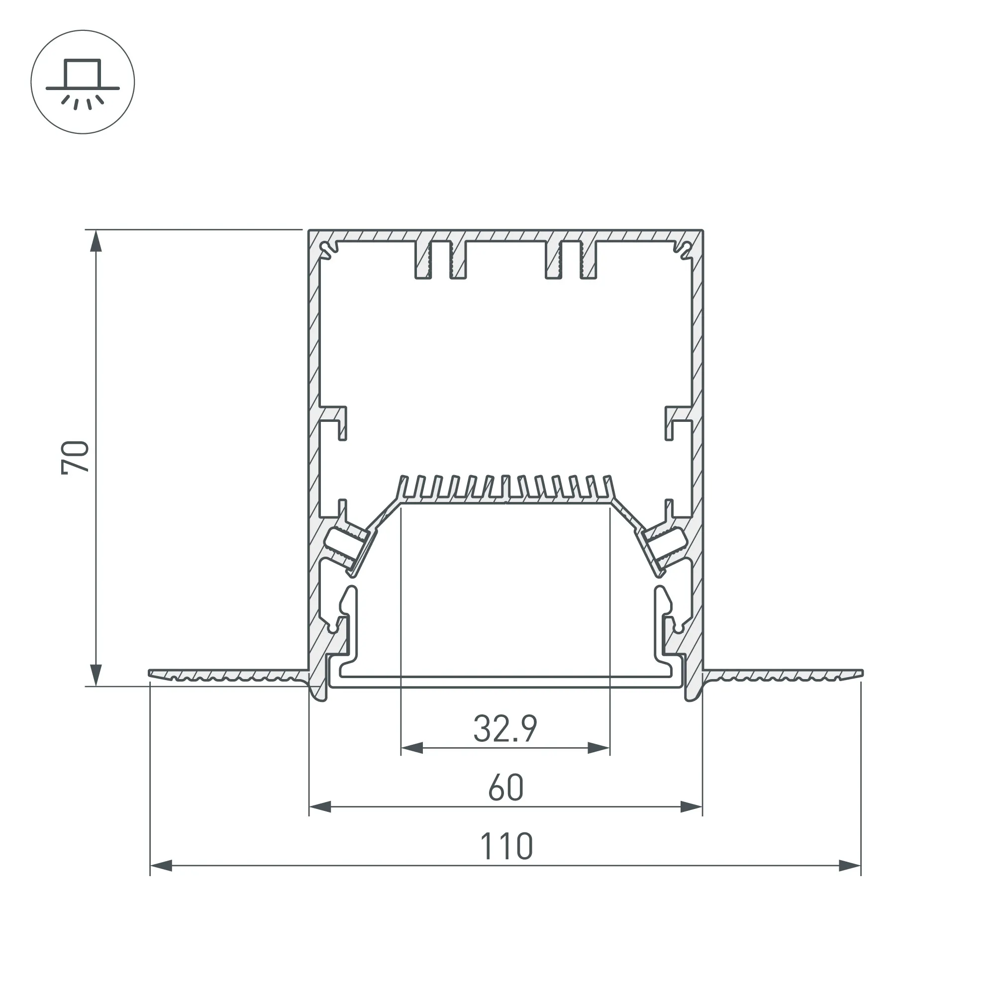 Алюминиевый анодированный профиль для светодиодных лент и линеек, с отсеком для блока питания (размер отсека 48x30мм). Габаритные размеры (L×W×H): 2000x110x70 мм. Паз для установки 70х60 мм. Ширина площадки для ленты 32,9 мм. Экраны, заглушки и другие аксессуары приобретаются отдельно. Цена за 1 метр.