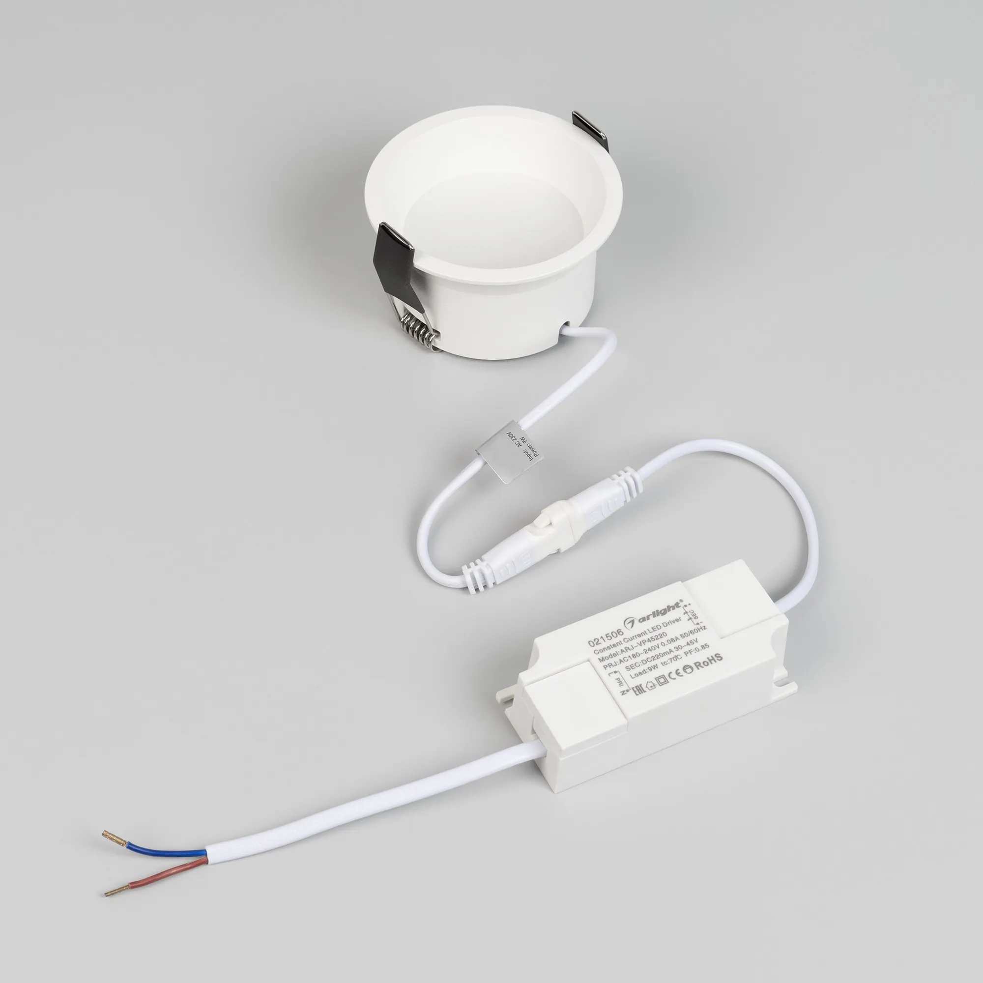 Встраиваемый светильник даунлайт. Мощность 9 Вт, св. поток 595 лм, 66 лм/Вт, тёплый 3000 K, CRI>90, угол 85°, напряжение питания 230 В. Белый круглый корпус из алюминия, степень защиты IP20. Размер: диаметр 82 мм, высота 46 мм. Монтаж встраиваемый, установочное отверстие: диаметр 75 мм. Драйвер 27-42 В, 200 мА, пульсация <2%.