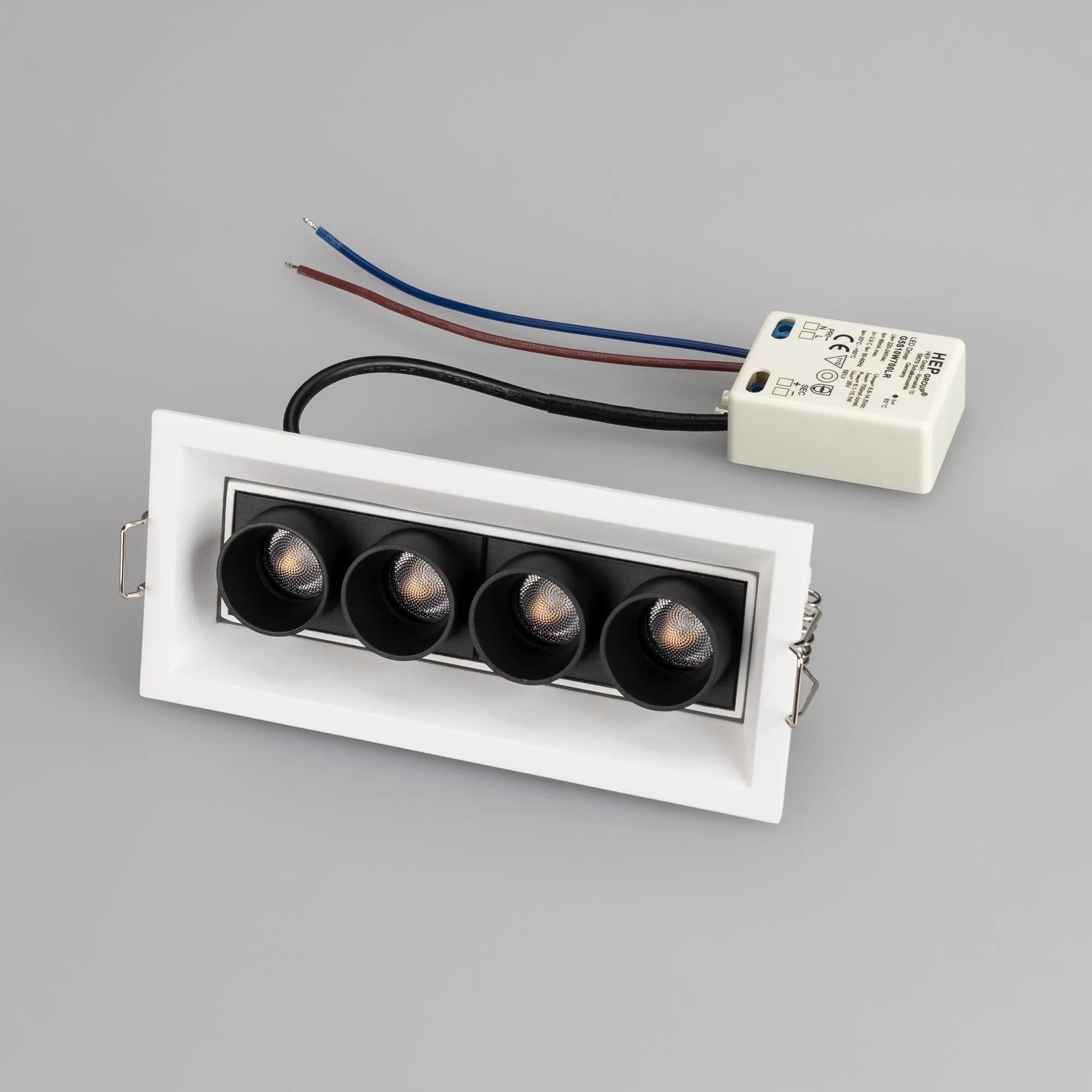Встраиваемый поворотный светильник. Мощность 10 Вт, св. поток 750 лм, 75 лм/Вт, теплый 3000 K, CRI>98, угол 30°, напряжение питания 230 В. Чёрный прямоугольный корпус из алюминия, экран PMMA, степень защиты IP20. Размер: длина 150 мм, ширина 67 мм, высота 50 мм. Монтаж встраиваемый, установочное отверстие длина 145 мм, ширина 60 мм. Драйвер 9-14 В, 700 мА, пульсация <1%.