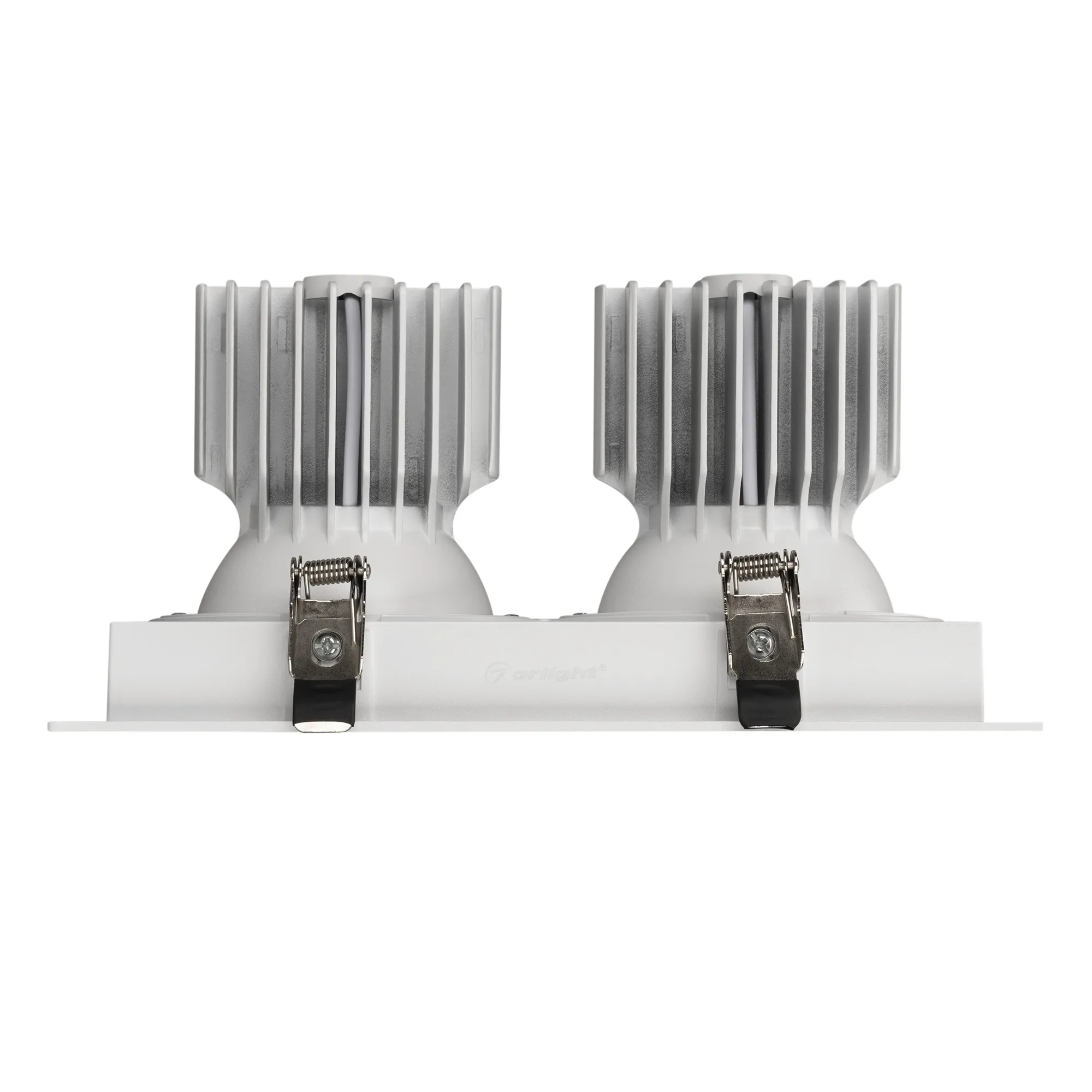 Встраиваемый карданный светильник. Мощность 2х30 Вт, св. поток 6208 лм, 103 лм/Вт, тёплый 3000 K, CRI>92, угол 17°, напряжение питания 230 В. Белый корпус из алюминия, белая вставка, степень защиты IP20. Размер: длина 250 мм, ширина 140 мм, высота 125 мм. Монтаж встраиваемый, установочное отверстие: длина 230 мм, ширина 120 мм. Драйвер 24-42 В, 750 мА, пульсация <2%.